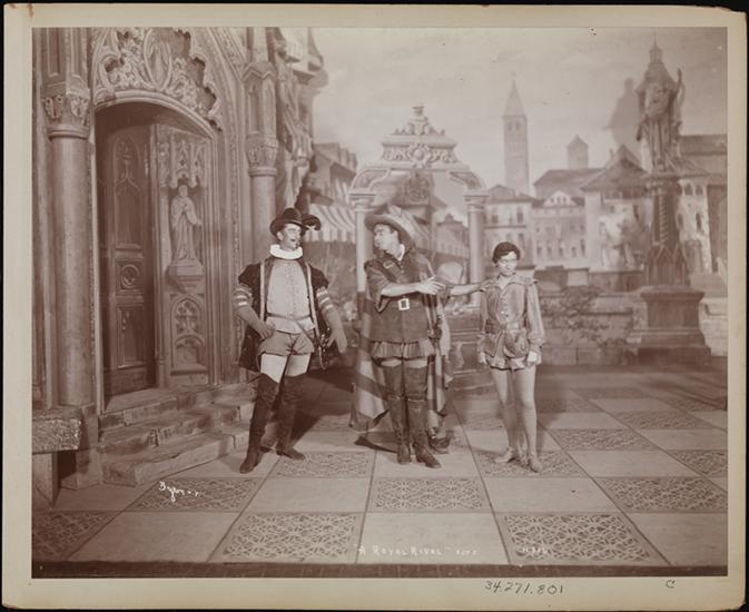 A scene from Gerald du Maurier's "A Royal Rival" presented by Charles Frohman at the Criterion Theatre in 1901-1902, featuring William Faversham as Don Cesar de Bazan and Julie Opp as Marita.