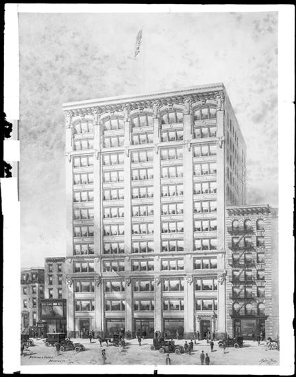 12th Street at the N.E. corner of 5th Avenue. Watercolor rendering of building by Hughson Hawley, 1911.