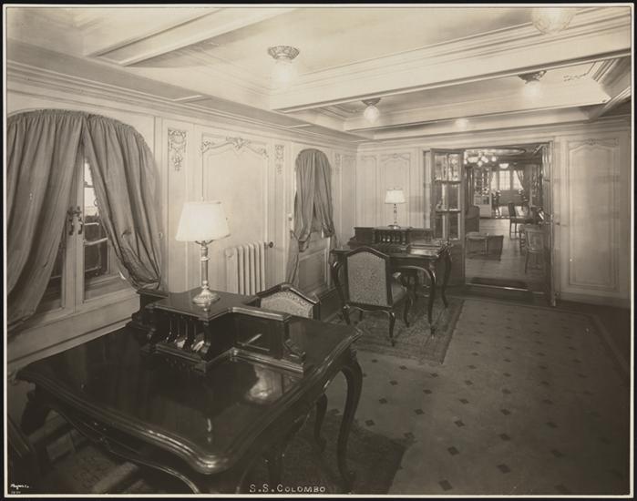 Italia-America Line, S.S. "Colombo", at Pier 95 North River, Interior, First Class Writing Room.