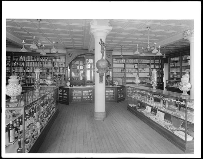 Westchester Avenue at the corner of Simpson Street. Riker's Drug Store interior.