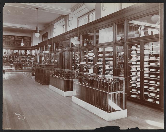 Showroom with wooden and glass cases filled with hats and umbrellas.