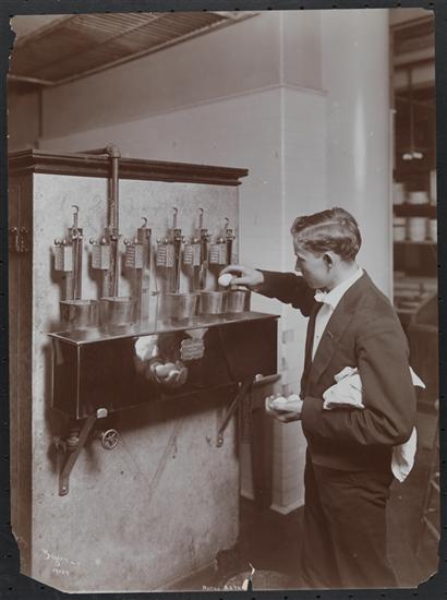 Waiter placing eggs in a special timed egg-cooking machine in the kitchen at the Hotel Astor, Broadway and 45th Street.