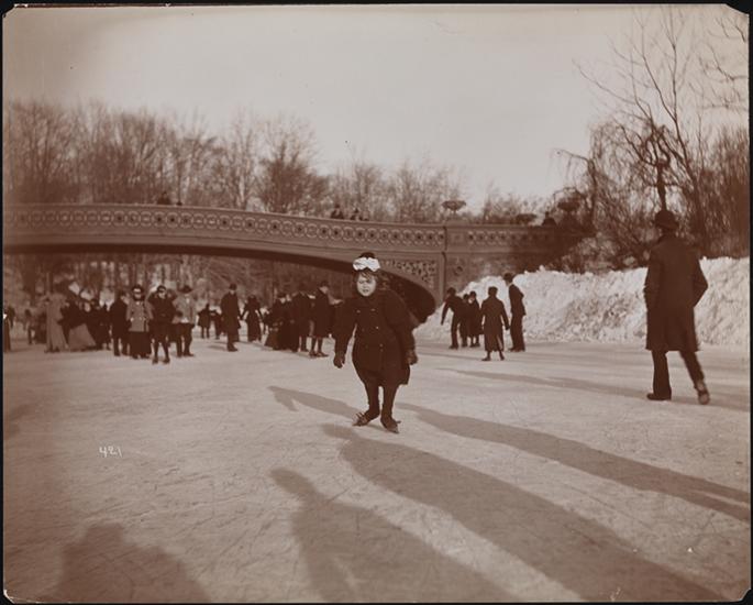 A girl ice skating on a frozen lake in Central Park with the Bow Bridge visible behind.