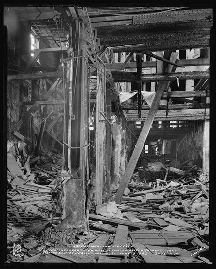 200 Broadway. Legal record view of fire damaged building, view from 3rd floor window in building to south and looking N.E. down into central court.