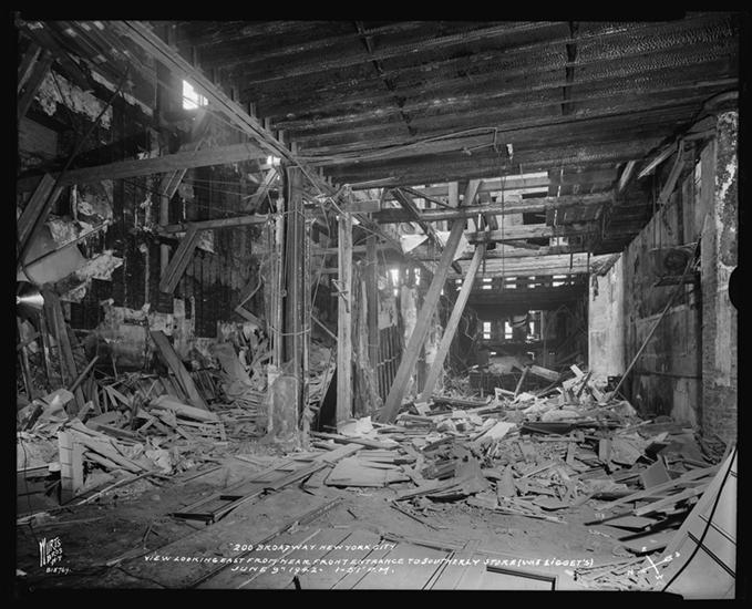 200 Broadway. Legal record view of fire damaged building, view from near partition wall between Liggets and Modells at columns, 2:05pm.