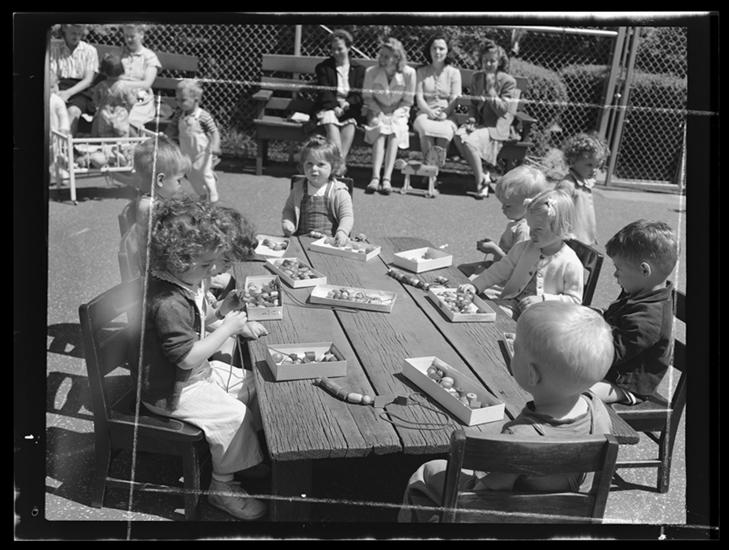 Phipps's Housing, children, boys, children's playground, "Toy War Tank," children, girls "house keeping" sand box.