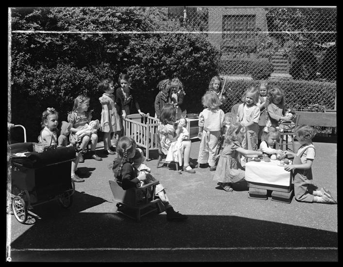 Phipps's Housing, children, boys, children's playground, "Toy War Tank," children, girls "house keeping" sand box.