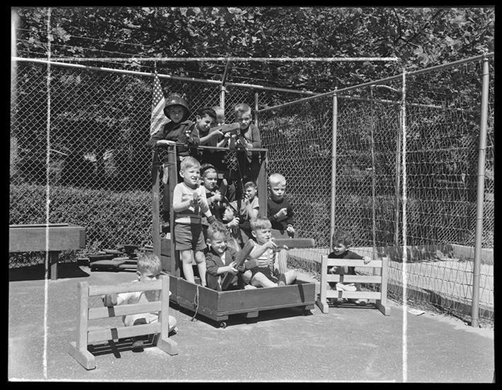 Phipps's Housing, children, boys, children's playground, "Toy War Tank," children, girls "house keeping" sand box.