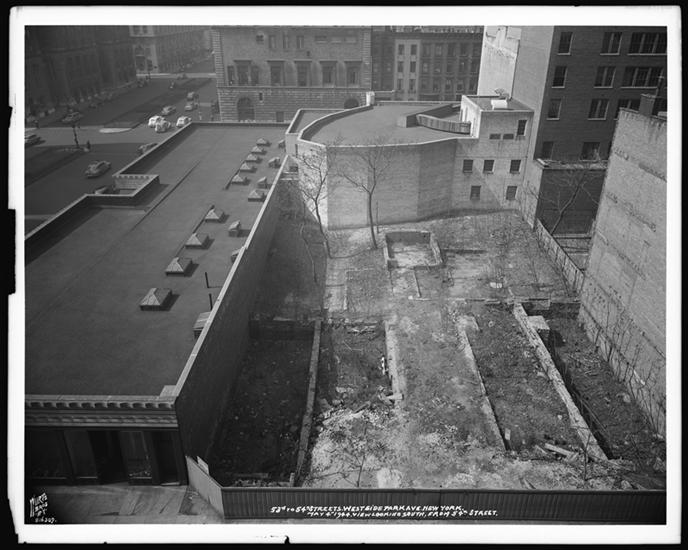 Park Avenue between 53rd and 54th Street, west side. Goelet estate property, stores, theater, and empty plot on 54th Street, view looking west.