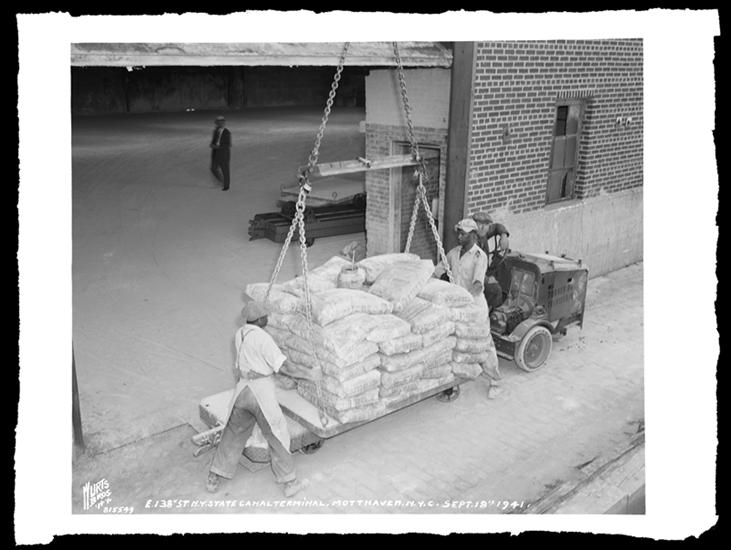 [Men unloading cargo at New York State Canal Terminal in Mott Haven.]