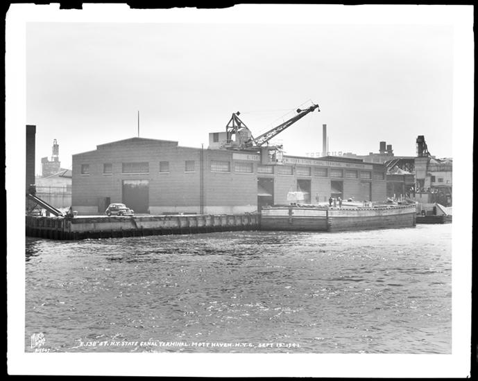 [Men unloading cargo at New York State Canal Terminal in Mott Haven.]