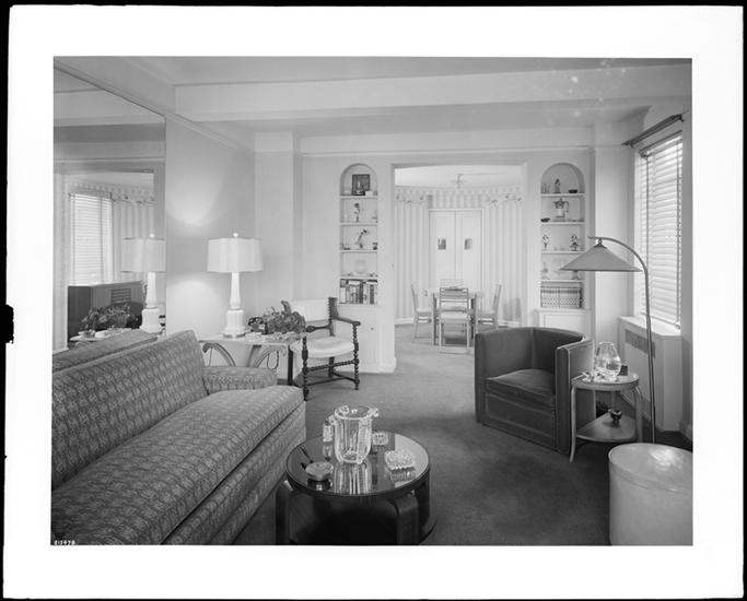 123 East 37th Street. Lindsley House apartments, interior, living room, apartment 5B, model apartment.