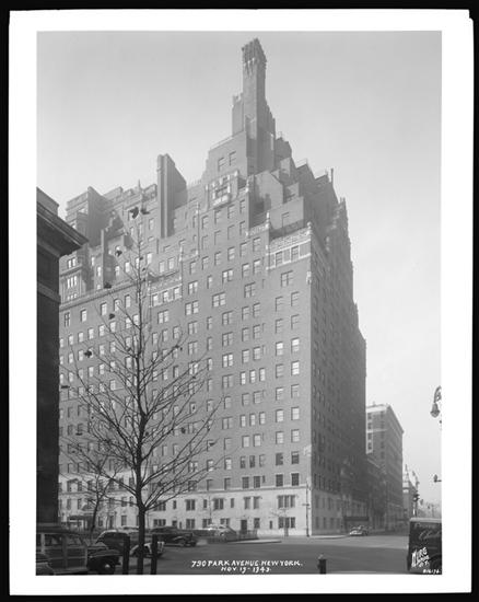 740 Park Avenue and 71st Street, N.W. corner. Apartment building exterior, general view.
