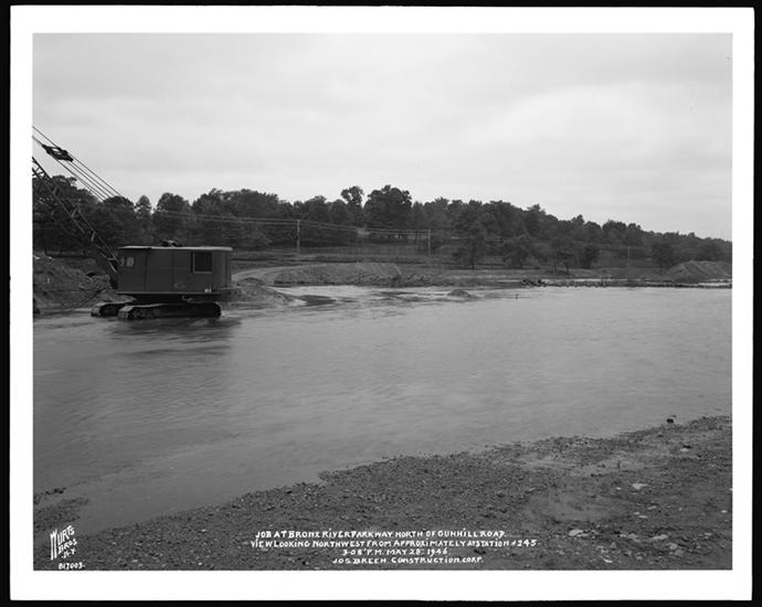 Bronx River Parkway north of Gun Hill Road. River dredging, legal record view, looking north from Gun Hill Road ramp, 2:10pm.