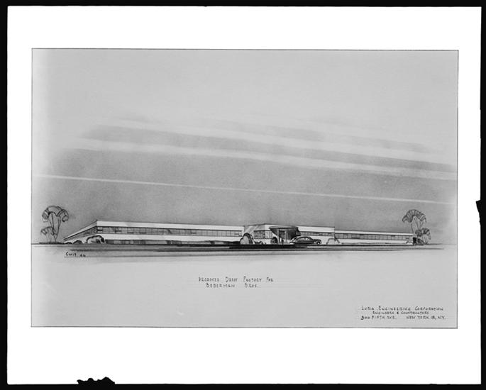 385 Gerard Avenue. Standard Unbreakable Watch Crystals, Inc., drawing of two story factory building by George Scheffler.