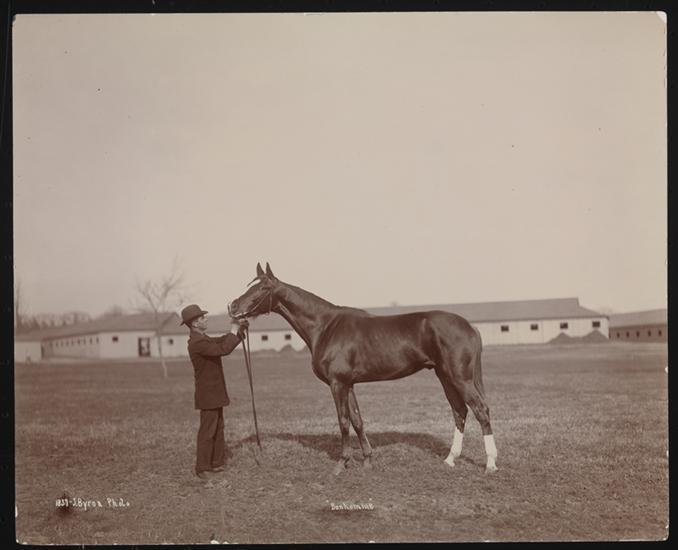 Description The thoroughbred race horse, Bonhomme, standing with a handler outside unidentified stables.