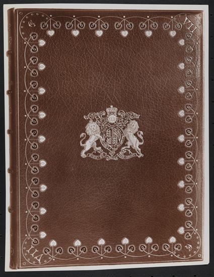 Close-up of a leather book cover with gilt decoration by Walter Dunn, publisher; "Prayer Book of Edward VII, 1903" visible on the spine of this cover in similar print.