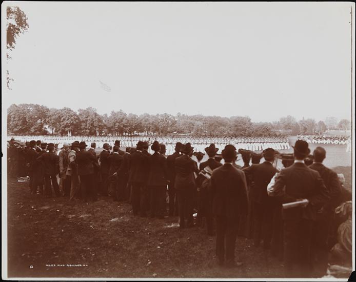 A crowd watching a military line-up of cadets at West Point Military Academy.