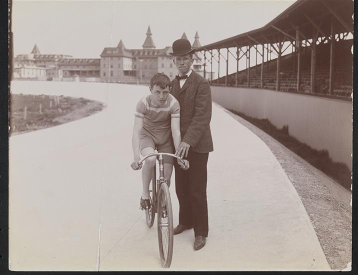 Description Portrait of Welsh bicycle racer Jimmy Micheals posed on his bike, held steady by another man on the track at Manhattan Beach.