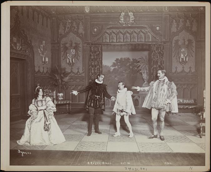 A scene from Gerald du Maurier's "A Royal Rival" presented by Charles Frohman at the Criterion Theatre in 1901-1902, featuring William Faversham as Don Cesar de Bazan and Julie Opp as Marita.