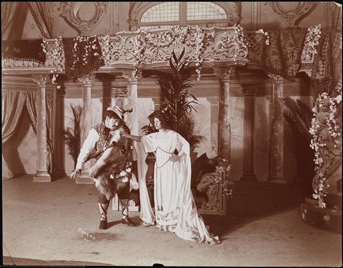 A scene from Weber and Fields' burlesque of Clyde Fitch's translation of Alphonse Daudet's "Sapho" called "Sapolio," a "Clean travesty of 'Sapho'" presented at the Weber and Fields Music Hall in 1900.