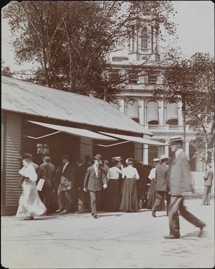 Street Scenes, Park Row, City Hall Park, Straus Milk Station.
