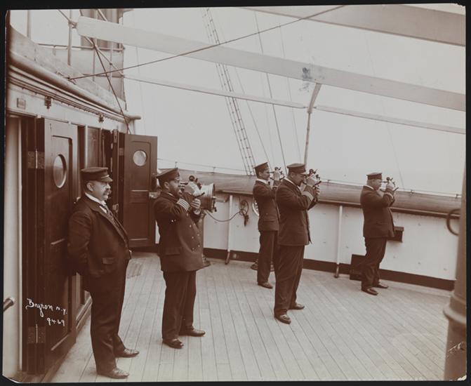 Five uniformed seamen on a deck of the S.S. "Deutschland" with navigation instruments.