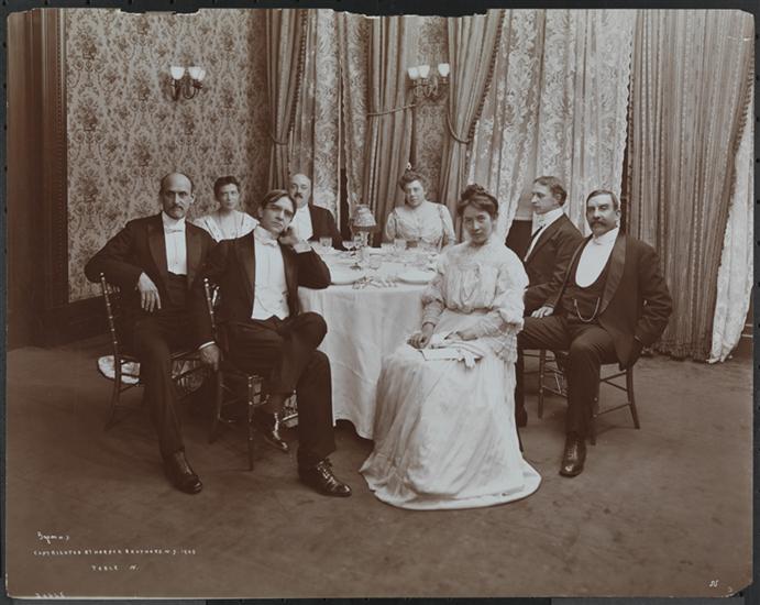 Group posed at a table at the dinner given to Mark Twain in honor of his 70th birthday at Delmonico's. This group is "Table N," including W.J. Lampton, Charles G.D. Roberts, R.K. Munkittrick, Elisabeth Luther Cary, Albert Bigelow Paine and Samuel Davis.