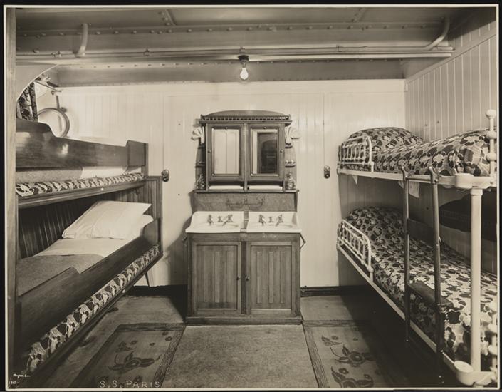 French Line, S.S. "Paris" Pier 88 N.R., Third Class, Interior, Inside 4 Berth Cabin #821.