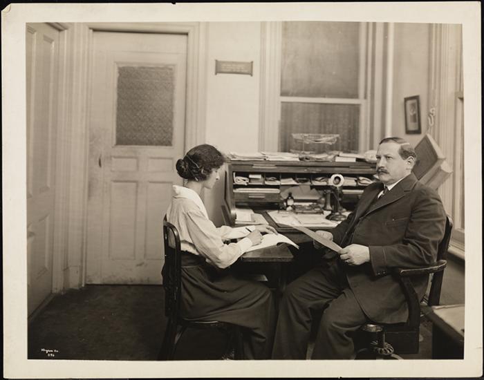 A secretary and her boss as he dictates to her in an office of the Crystal Chemical Co. at 134th Street & Willis Avenue.