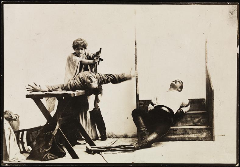 A scene from David Belasco's "The Heart of Maryland" featuring Mrs. Leslie Carter as Maryland Calvert and Maurice Barrymore as Col. Alan Kendrick.