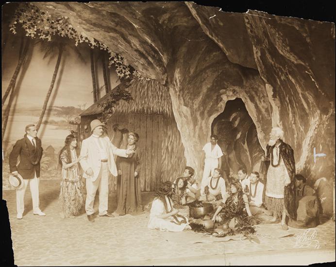 In pencil, on verso: Lewis S. Stone, Laurette Taylor, Theodore Roberts, / Ida Waterman, Albert Perry and Native Hawaiians- / Act I, "The Bird of Paradise," 1912 /Daly's.