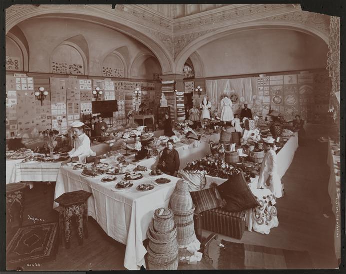 Description Room at the Children's Aid Society with table covered with food, baskets, cloths and children's art on walls.