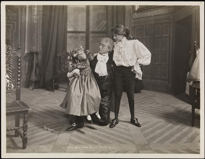 A scene from the one-act play "The Man Who Stole the Castle" by Tom Gallon and L.M. Lion featuring Aubrey Boucicault as Jack Dalwyn and Gertrude Toward as Sir Richard Elverton and presented at the Princess Theatre, Broadway and 29th Street, in 1903.