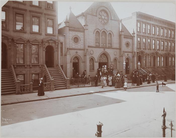 St. Thomas' Chapel (Protestant Episcopal) at 230 East 60th Street; congregation in front of chapel after service. Adjacent row houses are visible.