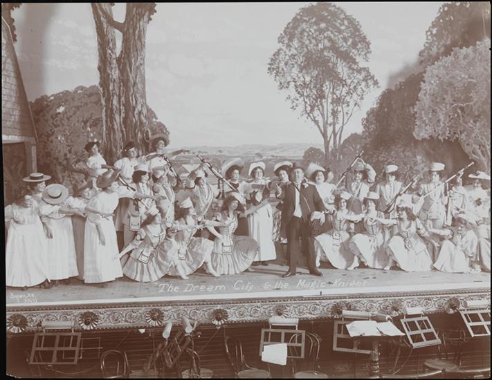 Otis Harlan and the chorus in a scene from the Weber & Field's comic musical review "Dream City."