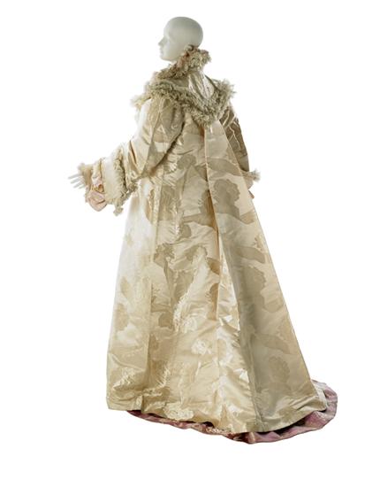 Evening dress in ivory satin with striped floral brocade and pink velvet