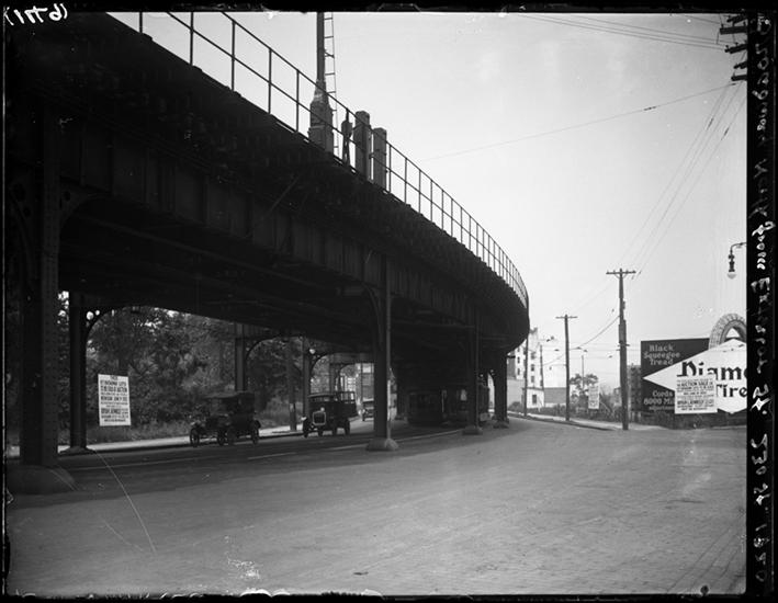 Broadway Series. Looking south from 130th Street underneath subway. The Manhattan Ave. station is seen in the middle distance.