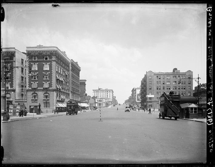 Broadway Series. View looking north from 181st Street. Church steeple in far distance. Blue Valley Butter on side of building at right in middle distance.