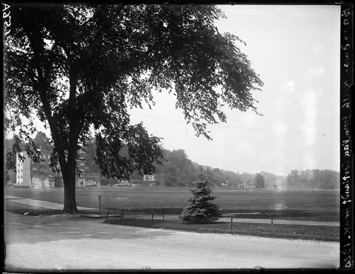 Broadway Series. Looking north on Broadway from Van Cortland Park. Horace Mann School is seen at the left edge of picture, above the trees, and on the heights.