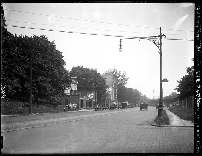 Broadway Series. Looking south from the roof of 3rd Avenue (Kingsbridge Division) car barns. Broadway is shown, over the roofs, at the extreme right, in the curve of the street at this point. The 215t