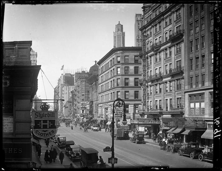 Broadway Series. View looking south from "El" platform at 33rd Street, showing east side of Broadway. This is Greeley Square. The United Cigar Store sign is in the building that stands on the corner o