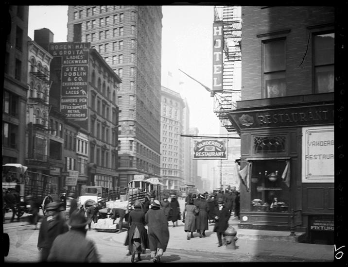 Broadway Series. View looking south from 31st Street (taken from 2nd floor window) showing east side of Broadway. The Grand Hotel is seen at left corner. Hofbrau House (Janssen's) is seen in middle di