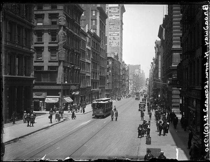 Broadway Series. Looking north on the west side of the street from Duane Street. On the corner at the left is the American Adding & Listing Machine Co. The American Calculating M. Co., The Rex Visible