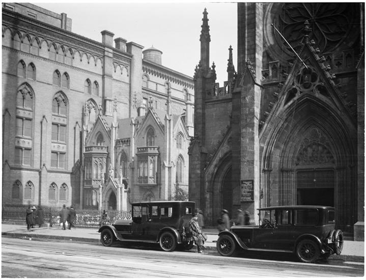 Broadway Series. East side of Broadway looking south from corner of 11th Street, toward 10th Street showing Grace Church and Wanamaker's, old and new building.
