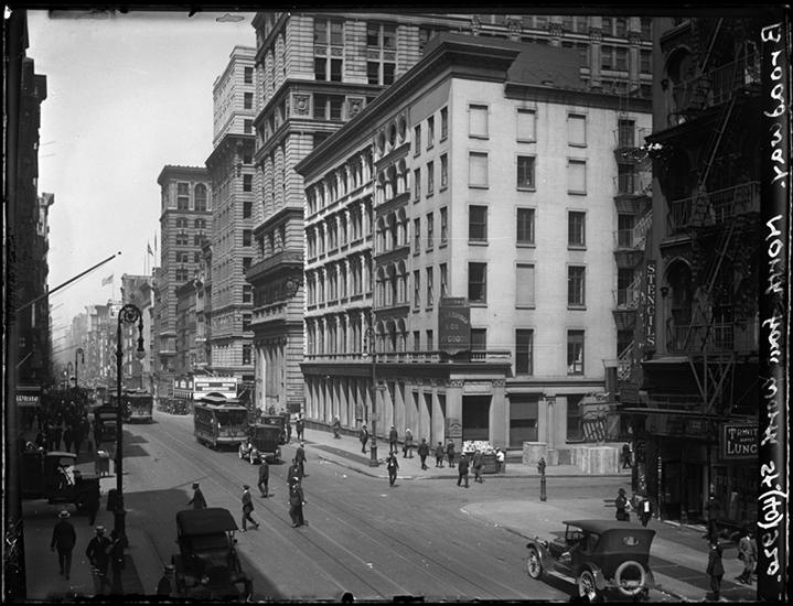 Broadway Series. View taken at street level looking north from Murray Street, the corner of which is seen at left. No. 249 and Corn Exchange Bank on corner. West side of Bway, facing City Hall Park. T
