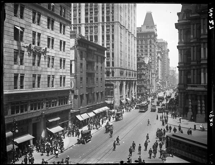 Broadway Series. Bway looking north from Exchange Place showing east side of street. Picture was taken from the second floor fire-escape of No. 53 Bway.