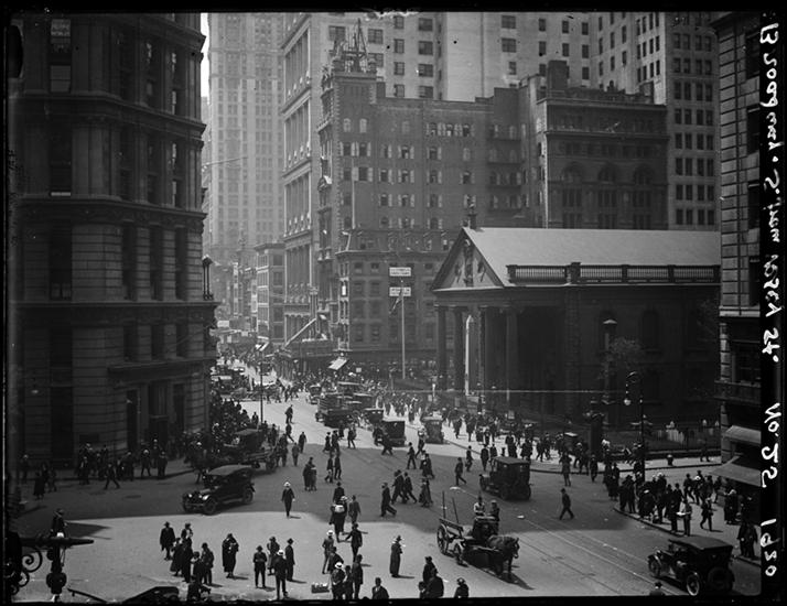Broadway Series. East side of street looking north showing almost complete view of St. Paul's Chapel which stands between Fulton and Vesey Streets. Taken from 2nd floor window.