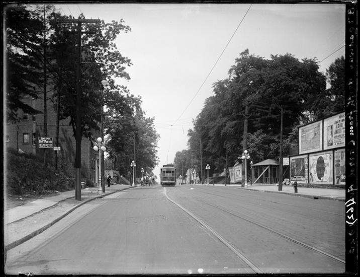 Broadway Series. Looking south from Caryl Avenue, city line. Chevrolet and Wrigley billboard signs at left.