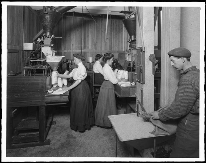 Franklin Street and Greenwich Street. B. Fischer and Co. Factory, filling and weighing coffee bags.